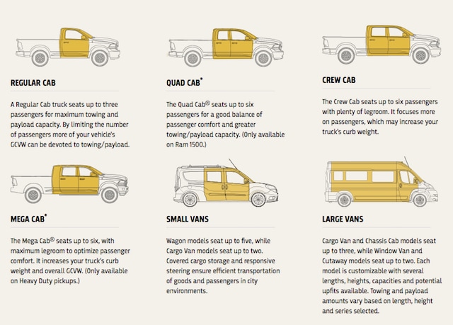 Simply put: the way your truck is built can affect what it can do. Cab size, box length, wheel drive, and transmission are influencers to how your truck can tow and haul. For instance, a regular cab can seat up to three passengers, which maximizes towing and payload. On the other hand, the Crew Cab can have six passengers with plenty of legroom, but focuses on passengers comfort more which adds to the truck's curb weight.