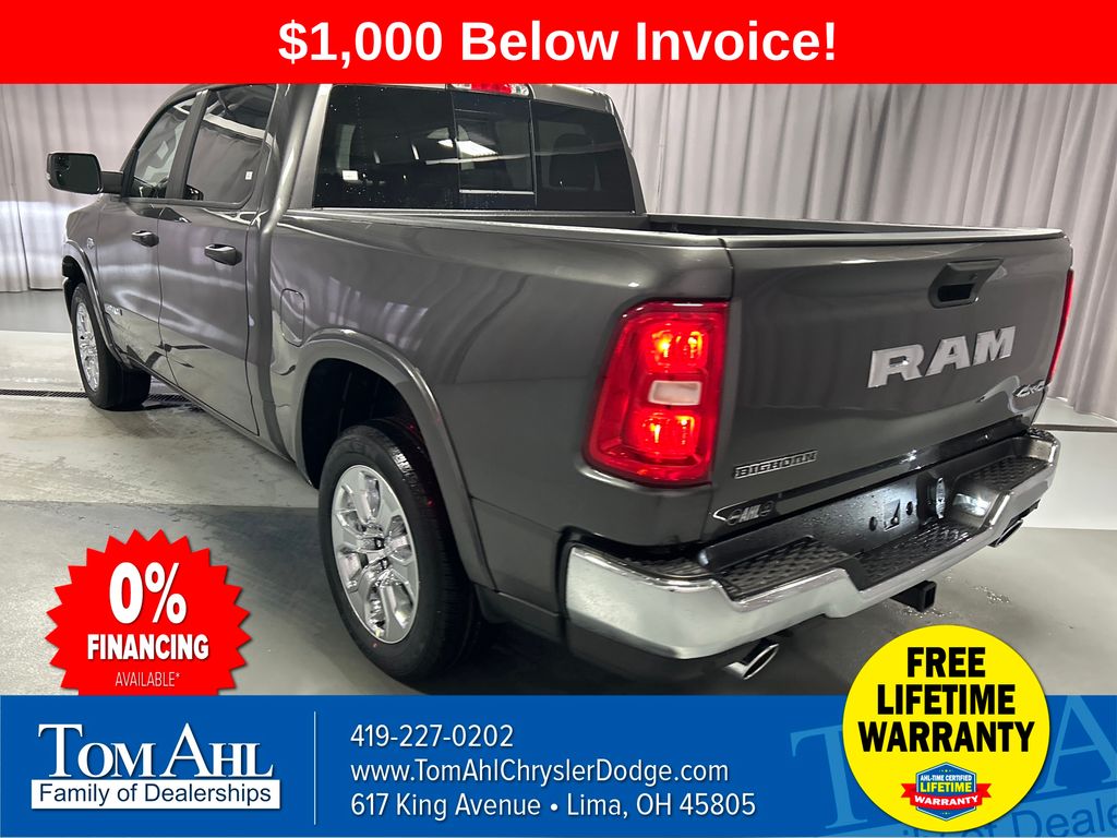 INCLUDES LIFETIME POWERTRAIN WARRANTY, 115V Auxiliary Power Outlet, 2nd Row in Floor Storage Bins, 3 Rear Seat Head Restraints, 4 Way Front Headrests, 400W Inverter, Auto Power-Folding Mirrors, Auto-Dimming Exterior Driver Mirror, Auto-Dimming Rear-View Mirror, Big Horn Level 1 Equipment Group, Black Exterior Mirrors, Black Premium Power Mirrors, Body Color Fender Flares, Bucket Seats, Center Console Parts Module, Convex Wide-Angle Exterior Mirror Insert, Deluxe Cloth Bucket Seats, Exterior Mirrors Courtesy Lamps, Exterior Mirrors with Heating Element, Exterior Mirrors with Supplemental Signals, Front Seat Back Map Pockets, Full Length Floor Console, Glove Box Lamp, Heated Front Seats, Heated Steering Wheel, Leather Wrapped Steering Wheel, Manual Adjust 4-Way Front Passenger Seat, Power 2-Way Driver Lumbar Adjust, Power Adjust 8-Way Driver Seat, Power Adjustable Pedals, Quick Order Package 27Z Big Horn, Rear 60/40 Folding Seat, Rear Center Armrest, Rear Dome with on/Off Switch Lamp, Rear Power Sliding Window, Rear Window Defroster, SiriusXM Radio Service, SiriusXM Satellite Radio, Steering Wheel Mounted Audio Controls, Sun Visors with Illuminated Vanity Mirrors, Universal Garage Door Opener. Price includes: $3500 - 2026 National Retail Bonus Cash . Exp. 03/31/2026