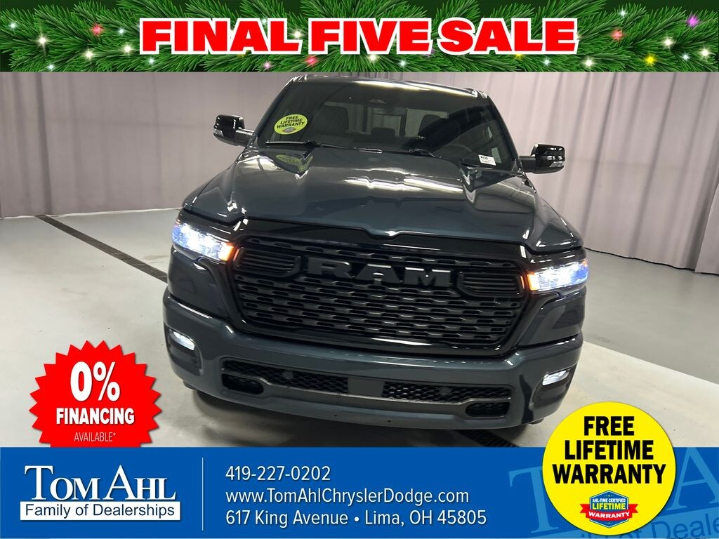 INCLUDES LIFETIME POWERTRAIN WARRANTY, 115V Auxiliary Power Outlet, 115V Auxiliary Rear Power Outlet, 12" Touchscreen Display, 2nd Row in Floor Storage Bins, 3 Rear Seat Head Restraints, 4 Way Front Headrests, 400W Inverter, 4G LTE Wi-Fi Hot Spot, 9 Amplified Speakers with Subwoofer, Accent Color Door Handles, Accent Color Premium Power Mirrors, Accent Color Tailgate Handle, Air Conditioning ATC with Dual Zone Control, Anti-Spin Differential Rear Axle, Apple CarPlay, Auto Power-Folding Mirrors, Auto-Dimming Exterior Driver Mirror, Auto-Dimming Rear-View Mirror, Big Horn Level 2 Equipment Group, Black Exterior Mirrors, Black Exterior Truck Badging, Black Headlamp Bezels, Black Interior Accents, Black Painted Exterior Mirrors Caps, Black Premium Power Mirrors, Black Tail Lamp Bezels, Body Color Fender Flares, Body Color Front Bumper, Body Color Rear Bumper with Step Pads, Bucket Seats, Center Console Parts Module, Cluster 7.0" TFT Color Display, Configurable Drive Mode, Connected Travel and Traffic Services, Connectivity - US/Canada, Convex Wide-Angle Exterior Mirror Insert, Deluxe Cloth Bucket Seats, Disassociated Touchscreen Display, Dual Exhaust with Black Tips, Exterior Mirrors Courtesy Lamps, Exterior Mirrors with Heating Element, Exterior Mirrors with Supplemental Signals, Front Seat Back Map Pockets, Full Length Floor Console, Global Telematics Box Module, Glove Box Lamp, Google Android Auto, GPS Antenna Input, GPS Navigation, Grille Black Surround Black Mesh, HD Radio, Heated Front Seats, Heated Steering Wheel, Integrated Center Stack Radio, Integrated Voice Command with Bluetooth, Leather Wrapped Steering Wheel, LED Dome Lamp with on/Off Switch, LED Footwell Lighting, Manual Adjust 4-Way Front Passenger Seat, Media Hub with 2 Charge Only USBs, Night Edition, Overhead LED Lamps, Power 2-Way Driver Lumbar Adjust, Power Adjust 8-Way Driver Seat, Power Adjustable Pedals, Premium Overhead Console, Quick Order Package 21Z Big Horn, Radio: Uconnect 5 Navigation with 12.0" Display, RAM Grille Badge - Black, Rear 60/40 Folding Seat, Rear Center Armrest, Rear Power Sliding Window, Rear Window Defroster, Remote Tailgate Release, Security Alarm, SiriusXM Radio Service, SiriusXM with 360L, Steering Wheel Mounted Audio Controls, Sun Visors with Illuminated Vanity Mirrors, Universal Garage Door Opener, USB Host Flip, Wheels: 20" x 9.0" Al Price includes: $3500 - 2026 National Retail Consumer Cash . Exp