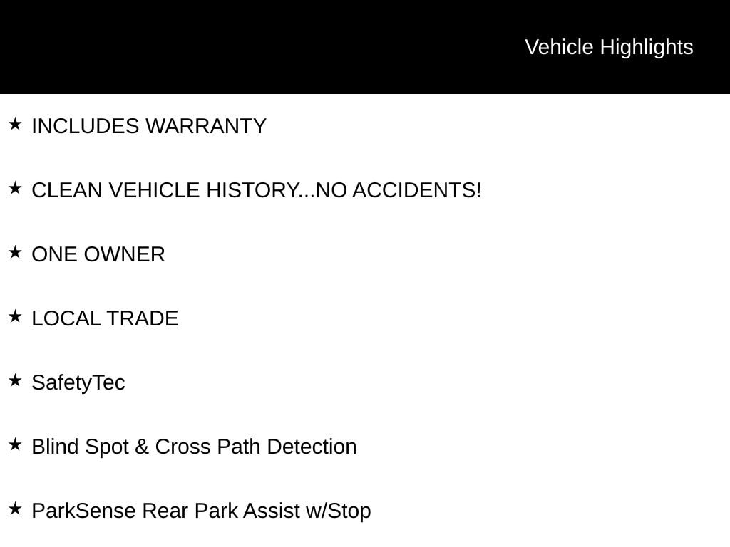 INCLUDES WARRANTY, CLEAN VEHICLE HISTORY...NO ACCIDENTS!, ONE OWNER, LOCAL TRADE, Blind Spot & Cross Path Detection, ParkSense Rear Park Assist w/Stop, SafetyTec.