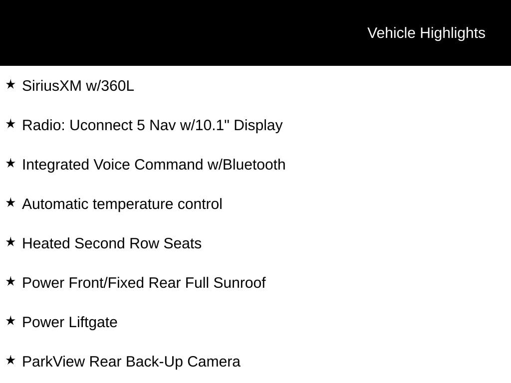 INCLUDES LIFETIME POWERTRAIN WARRANTY, REMAINDER OF FACTORY WARRANTY, ONE OWNER, 10.1" Touchscreen Display, 13 Alpine Speakers, 360 Surround View Camera System, 506 Watt Amplifier, 8-Passenger Seating, Amazon Fire TV Built-In, Apple CarPlay, Auto-Dimming Rear-View Mirror, Automatic temperature control, Blu-Ray/DVD Player/USB Port, Caprice Leatherette Bucket Seats, FamCAM Interior Camera, Front Passenger Auto Advance N Return, Google Android Auto, Hands Free Power Liftgate, Hands Free Sliding Doors, Heated Second Row Seats, Integrated Voice Command w/Bluetooth, KeySense, Navigation System, Parallel & Perpendicular Park Assist w/Stop, ParkSense Front/Rear Park Assist w/Stop, ParkView Rear Back-Up Camera, Power Adjust 8-Way Front Passenger Seat, Power Front/Fixed Rear Full Sunroof, Power Liftgate, Power Open/Close Shade, Radio: Uconnect 5 Nav w/10.1" Display, Safety Sphere, Seatback Video Screens, SiriusXM w/360L, Uconnect Theater Family Group.