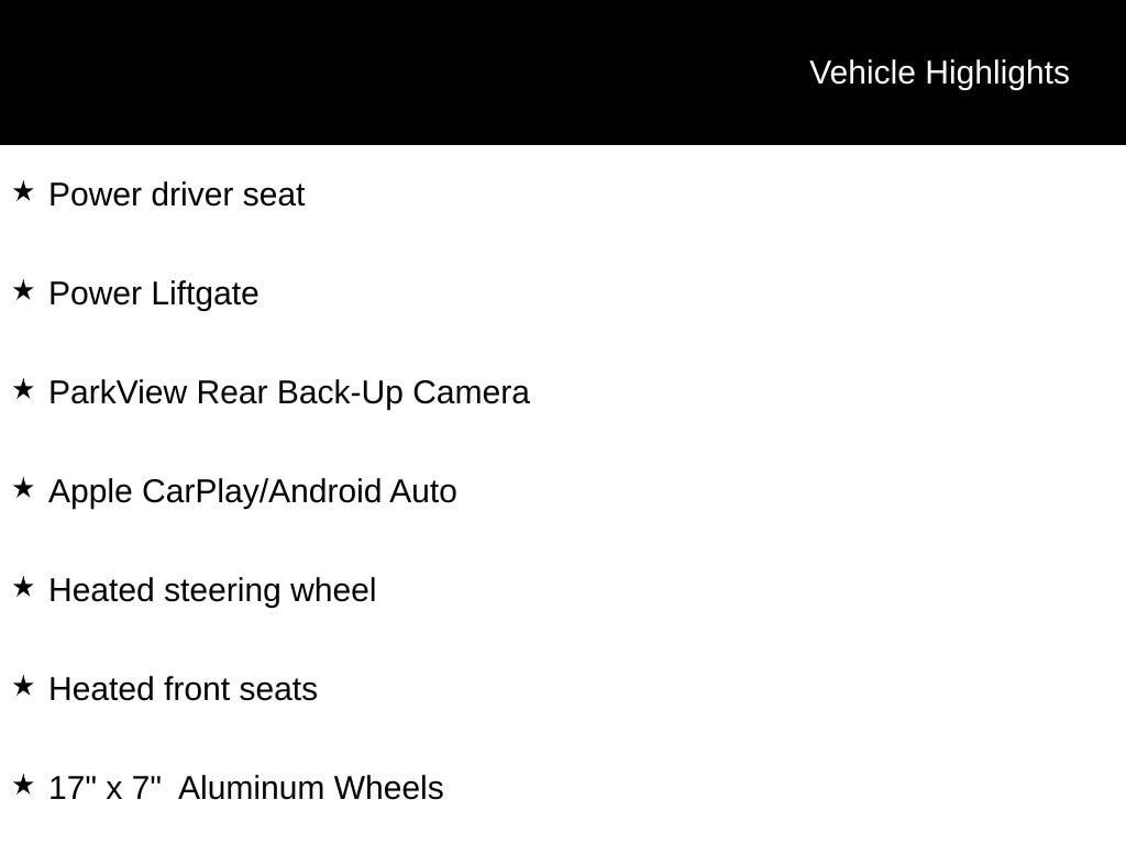 INCLUDES LIFETIME POWERTRAIN WARRANTY, REMAINDER OF FACTORY WARRANTY, CLEAN VEHICLE HISTORY...NO ACCIDENTS!, ONE OWNER, 17" x 7" Aluminum Wheels, AM/FM radio: SiriusXM, Apple CarPlay, Apple CarPlay/Android Auto, Automatic temperature control, Google Android Auto, Heated front seats, Heated steering wheel, ParkView Rear Back-Up Camera, Power driver seat, Power Liftgate.