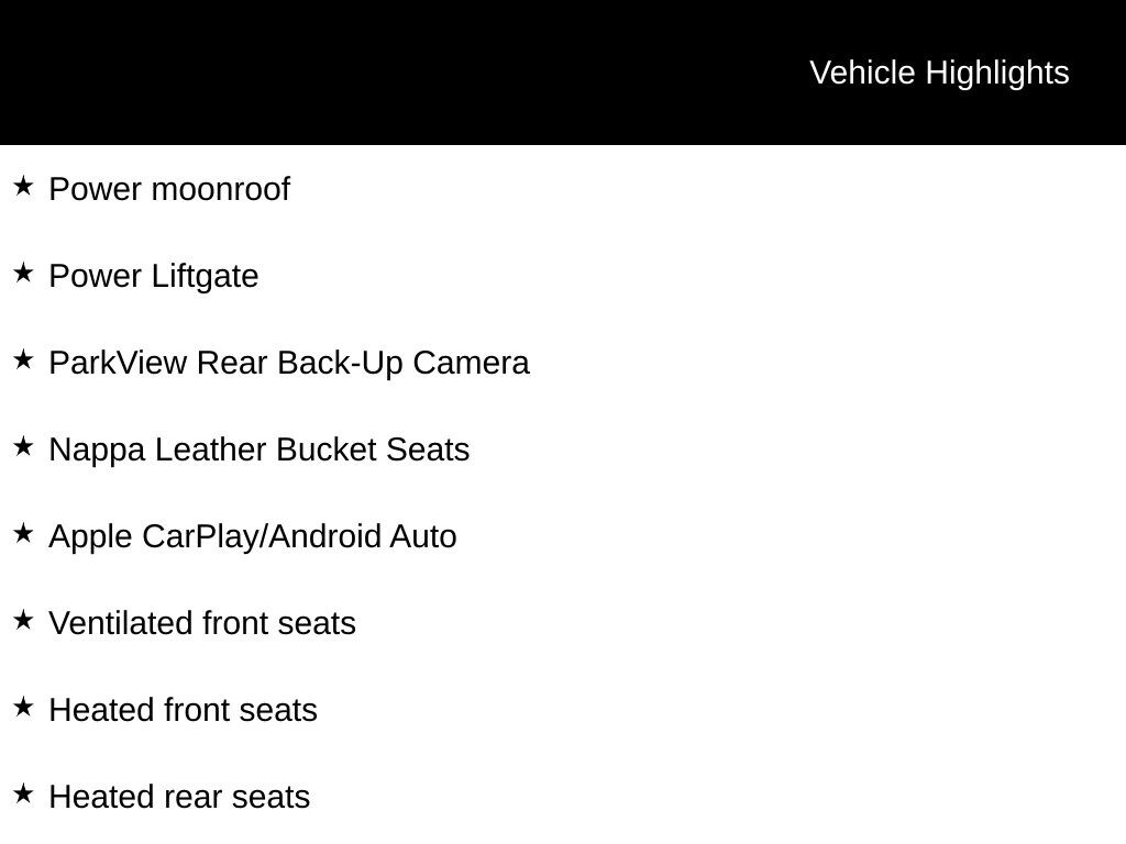 INCLUDES LIFETIME POWERTRAIN WARRANTY, REMAINDER OF FACTORY WARRANTY, CLEAN VEHICLE HISTORY...NO ACCIDENTS!, ONE OWNER, AM/FM radio: SiriusXM 360L, Apple CarPlay/Android Auto, Automatic temperature control, Heated front seats, Heated rear seats, Nappa Leather Bucket Seats, Navigation System, ParkView Rear Back-Up Camera, Power driver seat, Power Liftgate, Power moonroof, Ventilated front seats, Wheels: 18" x 7.5" Painted Aluminum Design 2.