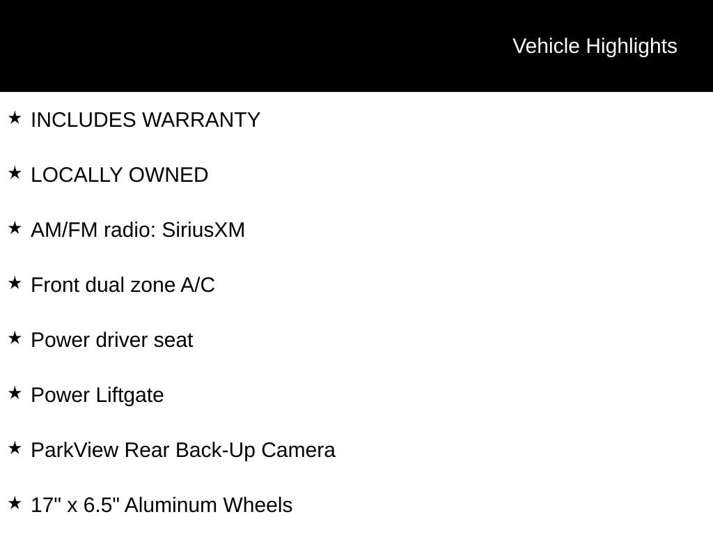 INCLUDES WARRANTY, LOCALLY OWNED, 17" x 6.5" Aluminum Wheels, AM/FM radio: SiriusXM, Front dual zone A/C, ParkView Rear Back-Up Camera, Power driver seat, Power Liftgate.