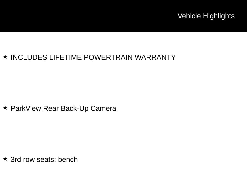 Priced below KBB Fair Purchase Price! INCLUDES LIFETIME POWERTRAIN WARRANTY, 3rd row seats: bench, ParkView Rear Back-Up Camera.