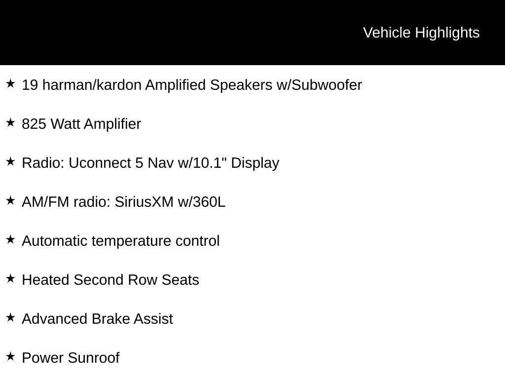 Priced below KBB Fair Purchase Price! INCLUDES LIFETIME POWERTRAIN WARRANTY, REMAINDER OF FACTORY WARRANTY, CLEAN VEHICLE HISTORY...NO ACCIDENTS!, ONE OWNER, AWD, 19 harman/kardon Amplified Speakers w/Subwoofer, 7 & 4 Pin Wiring Harness, 825 Watt Amplifier, Adaptive Cruise Control w/Stop, Advanced Brake Assist, AM/FM radio: SiriusXM w/360L, Auto High Beam Headlamp Control, Auto-Dimming Exterior Driver Mirror, Automatic temperature control, Black Roof Rails, Blacktop Package, Blind Spot w/Trailer Detection, Bright Cargo Area Scuff Pads, Class IV Receiver Hitch, Exterior Mirrors w/Heating Element, Exterior Mirrors w/Supplemental Signals, Floor Console w/Leather Armrest, Forged Carbon Fiber Interior Accents, Full Speed Forward Collision Warning Plus, Gloss Black Badges, Gloss Black Exterior Mirrors, Heated Second Row Seats, Integrated Roof Rail Crossbars, Lane Departure Warning Plus, Leather Trimmed Bucket Seats, Leather Wrapped Door Panels, LED Auxiliary Low Beam & Turn Signal, Navigation System, ParkView Rear Back-Up Camera, Power 6x9 Multi-Function Foldaway Mirrors, Power 8-Way Driver Memory 8-Way Passenger Seats, Power Driver/Passenger 4-Way Lumbar Adjust, Power Liftgate, Power Sunroof, Power Tilt & Telescopic Steering Column, Premium Instrument Panel, Quick Order Package 22U R/T Premium, Radio: Uconnect 5 Nav w/10.1" Display, Red Accent Stitching, Satin Black Dodge Tail Lamp Badge, Suede Headliner, Trailer Brake Control, Ventilated Front Seats, Wheels: 20" x 8.0" Black Noise Aluminum.