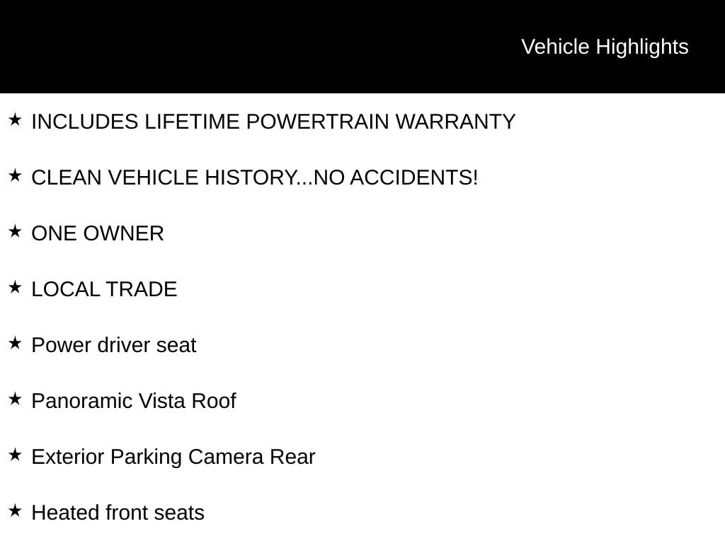 INCLUDES LIFETIME POWERTRAIN WARRANTY, CLEAN VEHICLE HISTORY...NO ACCIDENTS!, ONE OWNER, LOCAL TRADE, Exterior Parking Camera Rear, Heated front seats, Panoramic Vista Roof, Power driver seat, Wheels: 17" Shadow Silver-Painted Aluminum.