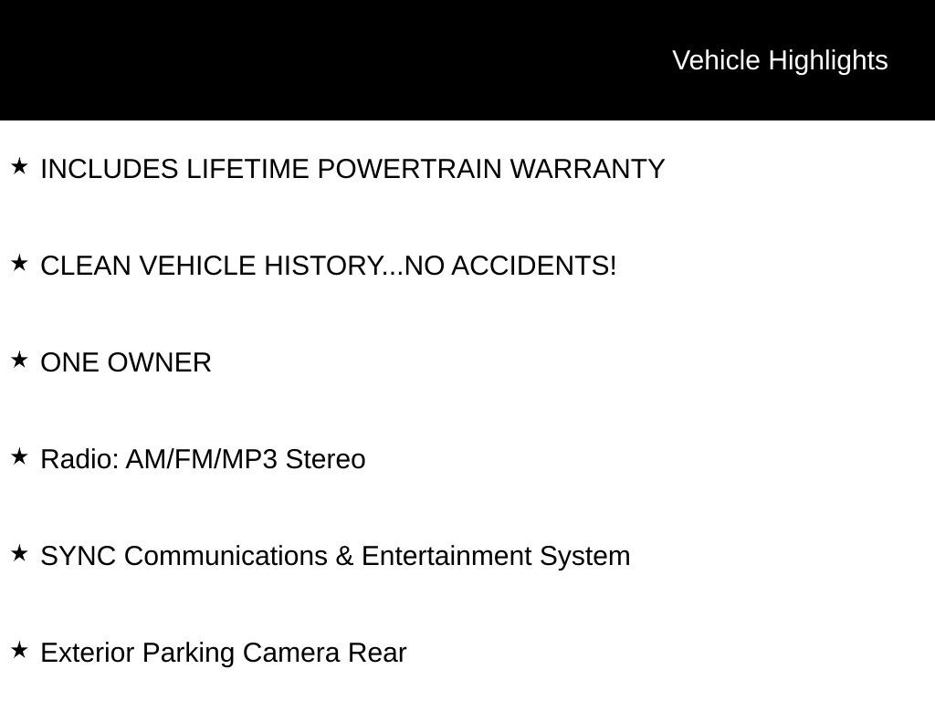 INCLUDES LIFETIME POWERTRAIN WARRANTY, CLEAN VEHICLE HISTORY...NO ACCIDENTS!, ONE OWNER, Exterior Parking Camera Rear, Radio: AM/FM/MP3 Stereo, SYNC Communications & Entertainment System.