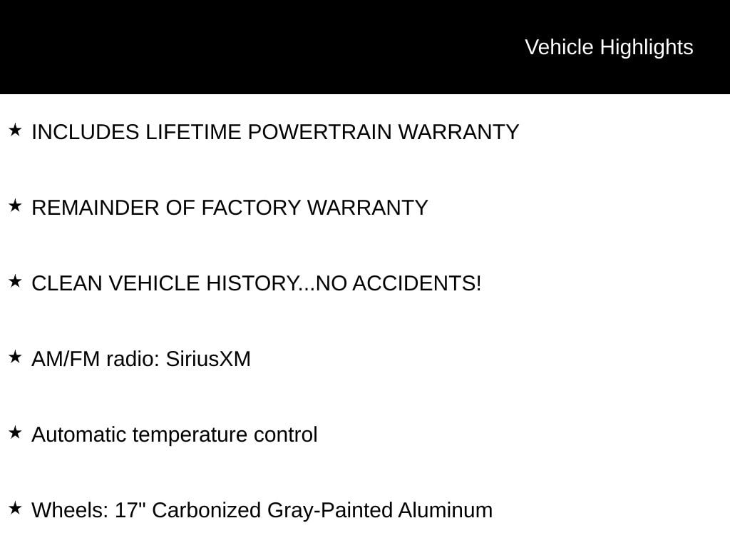 INCLUDES LIFETIME POWERTRAIN WARRANTY, REMAINDER OF FACTORY WARRANTY, CLEAN VEHICLE HISTORY...NO ACCIDENTS!, AM/FM radio: SiriusXM, Automatic temperature control, Wheels: 17" Carbonized Gray-Painted Aluminum.
