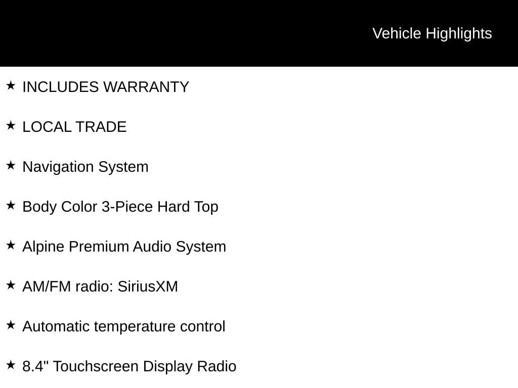 INCLUDES WARRANTY, LOCAL TRADE, 4WD, 8.4" Touchscreen Display Radio, Alpine Premium Audio System, AM/FM radio: SiriusXM, Apple CarPlay/Android Auto, Automatic temperature control, Body Color 3-Piece Hard Top, Navigation System, Rear Window Wiper/Washer, Wheels: 18" x 7.5" Polished w/Gray Spokes.