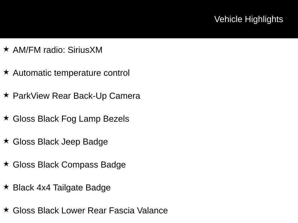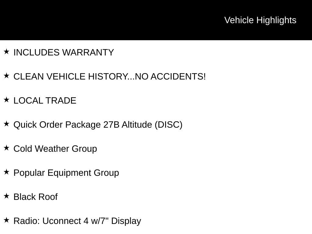 INCLUDES WARRANTY, CLEAN VEHICLE HISTORY...NO ACCIDENTS!, LOCAL TRADE, 4WD, Altitude Special Edition, AM/FM radio: SiriusXM, Auto-Dimming Rear-View Mirror, Automatic temperature control, Black 4x4 Tailgate Badge, Black Day Light Opening Moldings, Black Grille w/Black Rings, Black Roof, Bright Exhaust Tip, Cluster 7.0" Color Driver Info Display, Cold Weather Group, Gloss Black Compass Badge, Gloss Black Fog Lamp Bezels, Gloss Black Jeep Badge, Gloss Black Lower Rear Fascia Valance, Heated Front Seats, Heated Steering Wheel, ParkView Rear Back-Up Camera, Piano Black Interior Accents, Popular Equipment Group, Power 8-Way Driver/Manual 6-Way Passenger Seats, Quick Order Package 27B Altitude (DISC), Radio: Uconnect 4 w/7" Display, Wheels: 18" x 7.0" Black Aluminum.