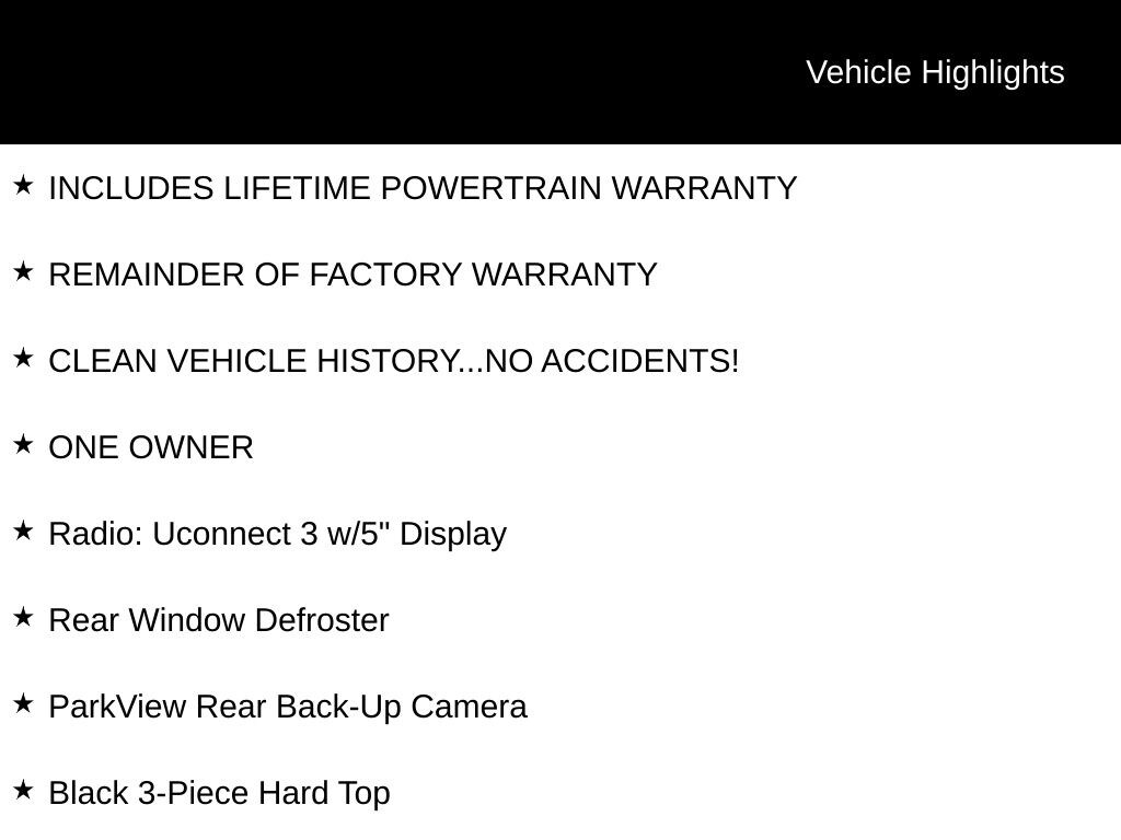 INCLUDES LIFETIME POWERTRAIN WARRANTY, REMAINDER OF FACTORY WARRANTY, CLEAN VEHICLE HISTORY...NO ACCIDENTS!, ONE OWNER, 4WD, Black 3-Piece Hard Top, Freedom Panel Storage Bag, No Soft Top, ParkView Rear Back-Up Camera, Radio: Uconnect 3 w/5" Display, Rear Window Defroster, Rear Window Wiper/Washer.