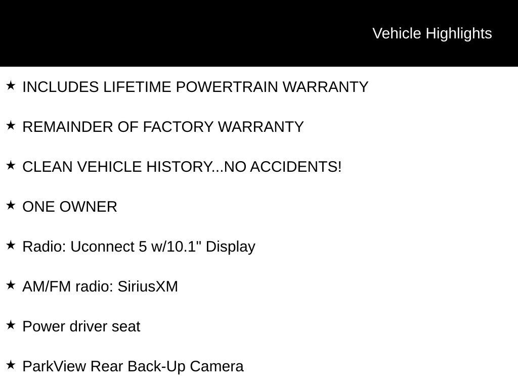 INCLUDES LIFETIME POWERTRAIN WARRANTY, REMAINDER OF FACTORY WARRANTY, CLEAN VEHICLE HISTORY...NO ACCIDENTS!, ONE OWNER, 4WD, AM/FM radio: SiriusXM, Heated front seats, Heated steering wheel, Leather Trimmed Bucket Seats, ParkView Rear Back-Up Camera, Power driver seat, Radio: Uconnect 5 w/10.1" Display, Wheels: 18" x 7.0" Painted Aluminum.