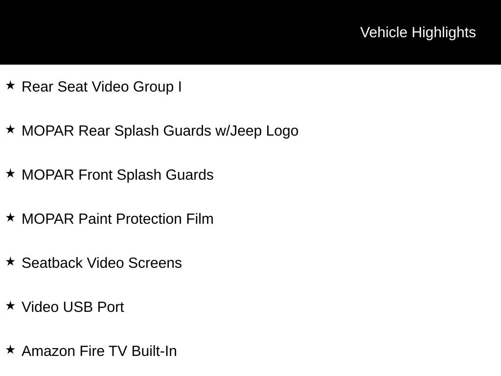 INCLUDES LIFETIME POWERTRAIN WARRANTY, REMAINDER OF FACTORY WARRANTY, CLEAN VEHICLE HISTORY...NO ACCIDENTS!, ONE OWNER, 4WD, Amazon Fire TV Built-In, MOPAR Finishing Package, MOPAR Front Splash Guards, MOPAR Paint Protection Film, MOPAR Rear Splash Guards w/Jeep Logo, Navigation System, Quick Order Package 23S, Rear Seat Video Group I, Seatback Video Screens, Two Tone Paint Group, Video USB Port.