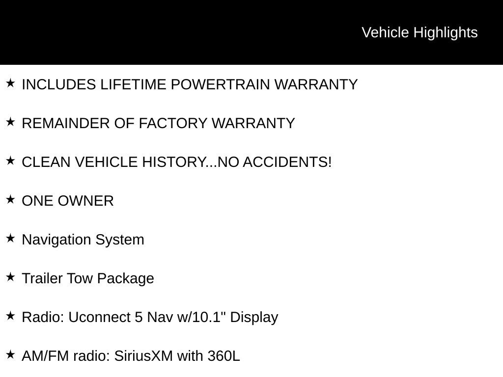 INCLUDES LIFETIME POWERTRAIN WARRANTY, REMAINDER OF FACTORY WARRANTY, CLEAN VEHICLE HISTORY...NO ACCIDENTS!, ONE OWNER, 4WD, 220 Amp Alternator, 7 & 4-Pin Wiring Harness, AM/FM radio: SiriusXM with 360L, Automatic Headlamp Levelling System, Automatic temperature control, Class IV Receiver Hitch, Dual-Pane Panoramic Sunroof, Heated front seats, Heated rear seats, Heated steering wheel, Navigation System, ParkView Rear Back-Up Camera, Power driver seat, Power Liftgate, Radio: Uconnect 5 Nav w/10.1" Display, Rear Load Levelling Suspension, Trailer Hitch Zoom, Trailer Tow Package, Wheels: 20" x 8.5" Machined/Painted Aluminum.