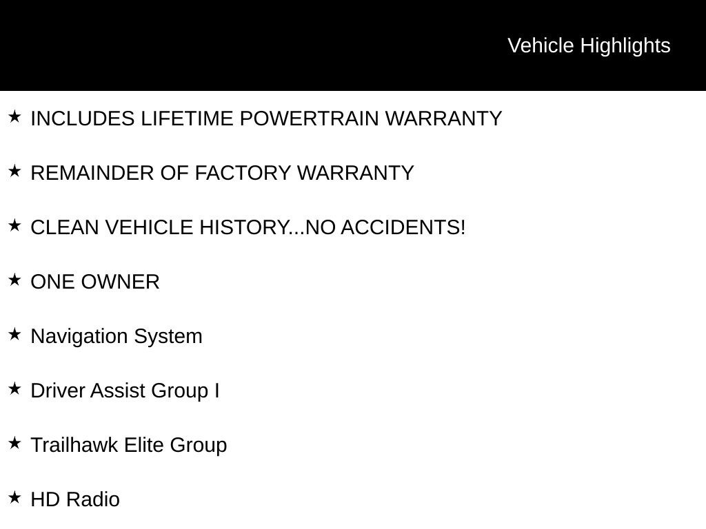 INCLUDES LIFETIME POWERTRAIN WARRANTY, REMAINDER OF FACTORY WARRANTY, CLEAN VEHICLE HISTORY...NO ACCIDENTS!, ONE OWNER, 4WD, 10.1" Touchscreen Display, 2nd Row USB Type A/C Charge Only, 360 Surround View Camera System, Active Driving Assist System, Alexa Built-In, Cluster 10.25" TFT Color Display, Connected Travel & Traffic Services, Driver Assist Group I, Driver Seat Memory, Foot Activated Open 'N Go Liftgate, HD Radio, Heated Front Seats, Heated Steering Wheel, Integrated Voice Command w/Bluetooth, LED Low/Highbeam Projector Headlamps, Navigation System, ParkView Rear Back-Up Camera, Power 2-Way Driver Lumbar Adjust, Power 2-Way Passenger Lumbar Adjust, Power 8-Way Adjust Front Passenger Seat, Power Adjust 8-Way Driver Seat, Power Liftgate, Premium Leather Trimmed Bucket Seats, Premium LED Fog Lamps, Premium Taillamps, Remote Start System, SiriusXM w/360L, Traffic Sign Recognition, Trailhawk Elite Group, Ventilated Front Seats, Wheels: 17" x 6.5" Painted Black Aluminum, Windshield Wiper De-Icer, Wireless Charging Pad.