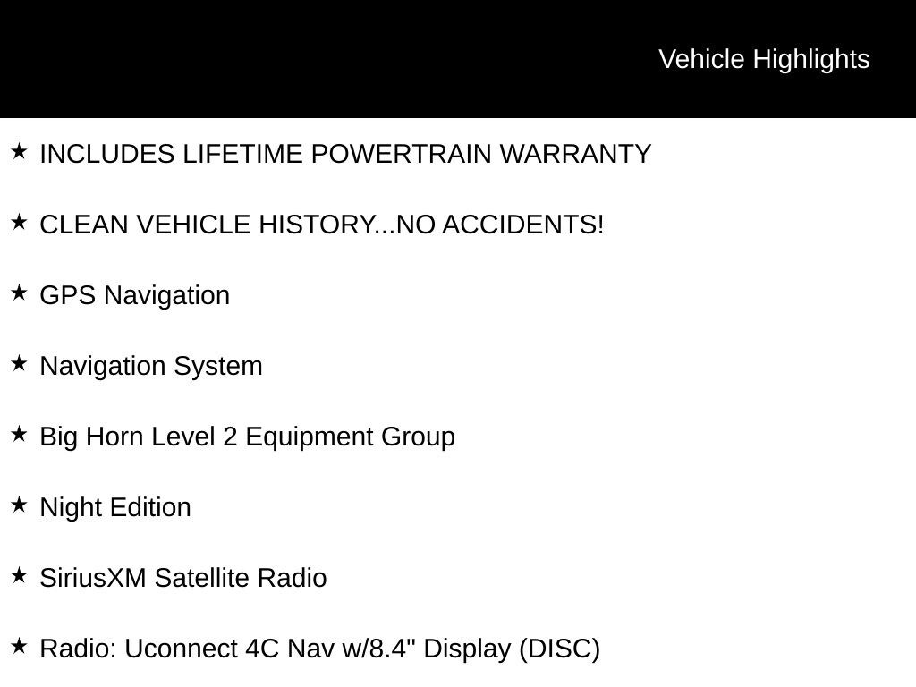 INCLUDES LIFETIME POWERTRAIN WARRANTY, CLEAN VEHICLE HISTORY...NO ACCIDENTS!, 4D Quad Cab, 4WD, 8.4" Touchscreen Display Radio, Air Conditioning ATC w/Dual Zone Control, Anti-Spin Differential Rear Axle, Apple CarPlay, Big Horn Level 2 Equipment Group, Class IV Receiver Hitch, Dual Exhaust w/Black Tips, Google Android Auto, GPS Navigation, Heated Front Seats, Heated Steering Wheel, Integrated Voice Command w/Bluetooth, Navigation System, Night Edition, ParkSense Front/Rear Park Assist w/Stop, ParkView Rear Back-Up Camera, Power Adjustable Pedals, Radio: Uconnect 4C Nav w/8.4" Display (DISC), Rear Power Sliding Window, SiriusXM Satellite Radio, Wheels: 20" x 9.0" Premium Paint/Polished.