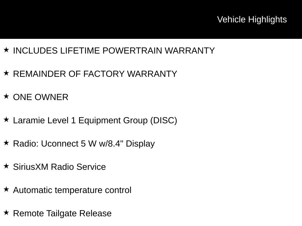 INCLUDES LIFETIME POWERTRAIN WARRANTY, REMAINDER OF FACTORY WARRANTY, ONE OWNER, 4D Crew Cab, HEMI 5.7L V8 Multi Displacement VVT, 4WD, Apple CarPlay/Android Auto, Auto High Beam Headlamp Control, Automatic temperature control, Blind Spot & Cross Path Detection, Heated Front Seats, Laramie Level 1 Equipment Group (DISC), Leather Trim 40/20/40 Bench Seat, ParkSense Front/Rear Park Assist w/Stop, Radio: Uconnect 5 W w/8.4" Display, Rain Sensitive Windshield Wipers, Rear 60/40 Folding Split Recline Seat, Rear Underseat Compartment Storage, Remote Tailgate Release, SiriusXM Radio Service, Ventilated Front Seats.