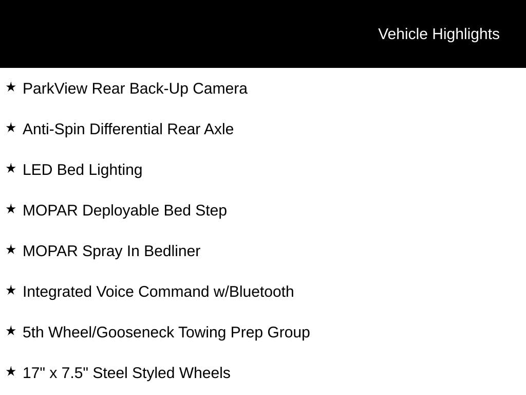 INCLUDES LIFETIME POWERTRAIN WARRANTY, REMAINDER OF FACTORY WARRANTY, CLEAN VEHICLE HISTORY...NO ACCIDENTS!, ONE OWNER, 4D Crew Cab, 6.4L V8, 4WD, 17" x 7.5" Steel Styled Wheels, 5th Wheel/Gooseneck Towing Prep Group, AM/FM radio, Anti-Spin Differential Rear Axle, Bed Utility Group, Integrated Voice Command w/Bluetooth, LED Bed Lighting, MOPAR Deployable Bed Step, MOPAR Spray In Bedliner, ParkView Rear Back-Up Camera, Protection Group, Radio: Uconnect 3 w/5" Display.