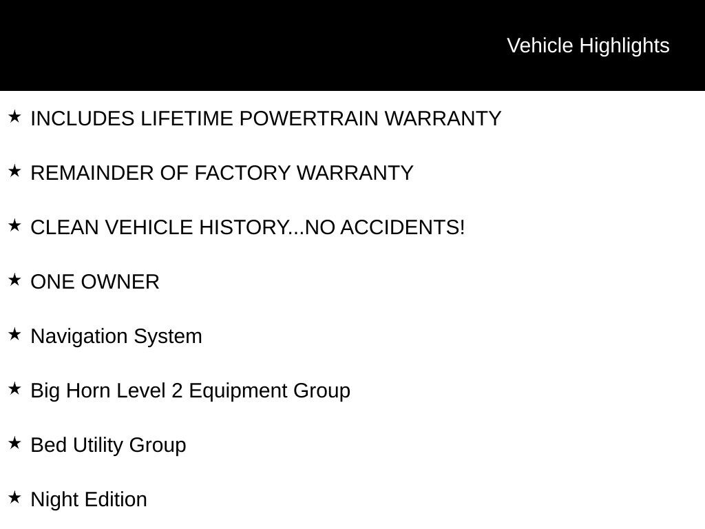 INCLUDES LIFETIME POWERTRAIN WARRANTY, REMAINDER OF FACTORY WARRANTY, CLEAN VEHICLE HISTORY...NO ACCIDENTS!, ONE OWNER, 4D Crew Cab, 3.0L I6, 4WD, 12" Touchscreen Display, 9 Amplified Speakers w/Subwoofer, Air Conditioning ATC w/Dual Zone Control, Anti-Spin Differential Rear Axle, Apple CarPlay, Auto Power-Folding Mirrors, Auto-Dimming Rear-View Mirror, Bed Utility Group, Big Horn Level 2 Equipment Group, Black Exterior Truck Badging, Black Headlamp Bezels, Black Painted Exterior Mirrors Caps, Black Premium Power Mirrors, Black Tail Lamp Bezels, Body Color Front Bumper, Body Color Rear Bumper w/Step Pads, Deluxe Cloth Bucket Seats, Dual-Pane Panoramic Sunroof, Google Android Auto, Grille Black Surround Black Mesh, Heated Front Seats, Heated Steering Wheel, Integrated Voice Command w/Bluetooth, Leather Wrapped Steering Wheel, LED Dome Lamp w/On/Off Switch, LED Footwell Lighting, MOPAR 4 Adjustable Cargo Tie-Down Hooks, MOPAR Spray In Bedliner, Navigation System, Night Edition, ParkView Rear Back-Up Camera, Power Adjust 8-Way Driver Seat, Power Adjustable Pedals, Radio: Uconnect 5 Nav w/12.0" Display, RAM Grille Badge - Black, Rear Power Sliding Window, Rear Window Defroster, Remote Tailgate Release, SiriusXM w/360L, Steering Wheel Mounted Audio Controls, Wheels: 20" x 9.0" Aluminum Painted Clad.