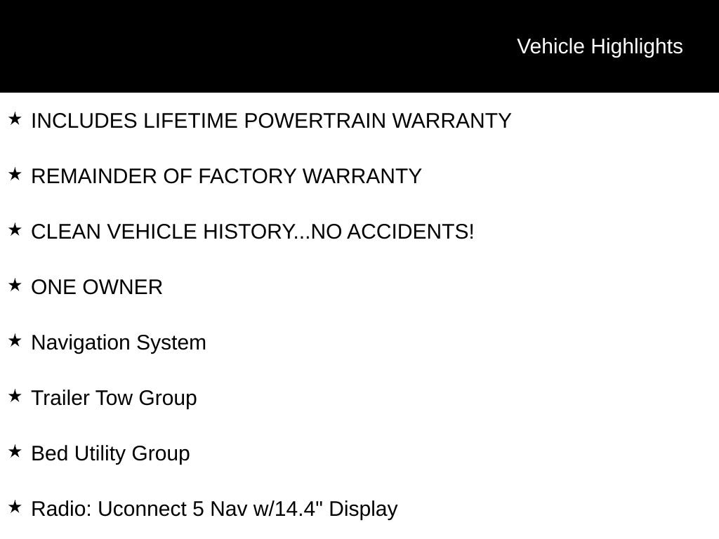 INCLUDES LIFETIME POWERTRAIN WARRANTY, REMAINDER OF FACTORY WARRANTY, CLEAN VEHICLE HISTORY...NO ACCIDENTS!, ONE OWNER, 4D Crew Cab, 3.0L I6, 4WD, AM/FM radio: SiriusXM with 360L, Apple CarPlay/Android Auto, Automatic temperature control, Bed Utility Group, Heads-Up Display, Heated front seats, Heated rear seats, Heated steering wheel, MOPAR 4 Adjustable Cargo Tie-Down Hooks, Navigation System, Power moonroof, Radio: Uconnect 5 Nav w/14.4" Display, Trailer Brake Control, Trailer Light Check, Trailer Reverse Steering Control, Trailer Tire Pressure Monitoring System, Trailer Tow Group, Truck Bed Cargo Divider, Ventilated front seats, Ventilated rear seats, Wheels: 22" x 9" Polish/Painted w/Inserts.